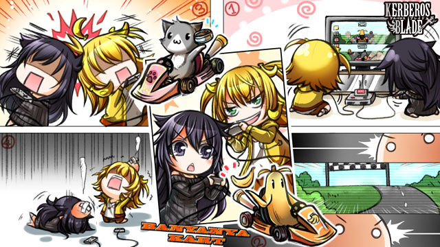 バニャニャカートで勝負!なイラスト。周りのチビキャラとか描くの楽しいです。