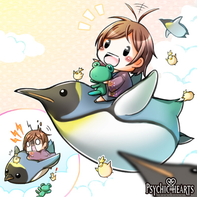 空飛ぶペンギンに乗って。ピヨと一緒ということで張り切らせていただきました。