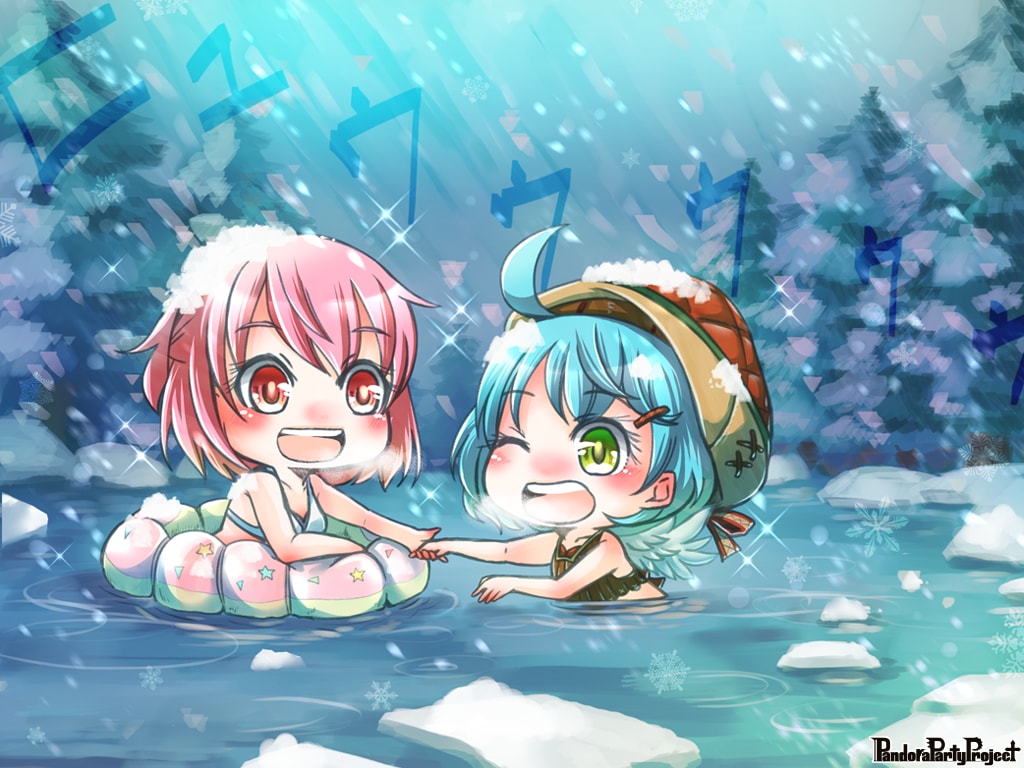 雪や氷が浮く湖でキャッキャウフフ。ツラそうに見えないようコミカル寄りに。